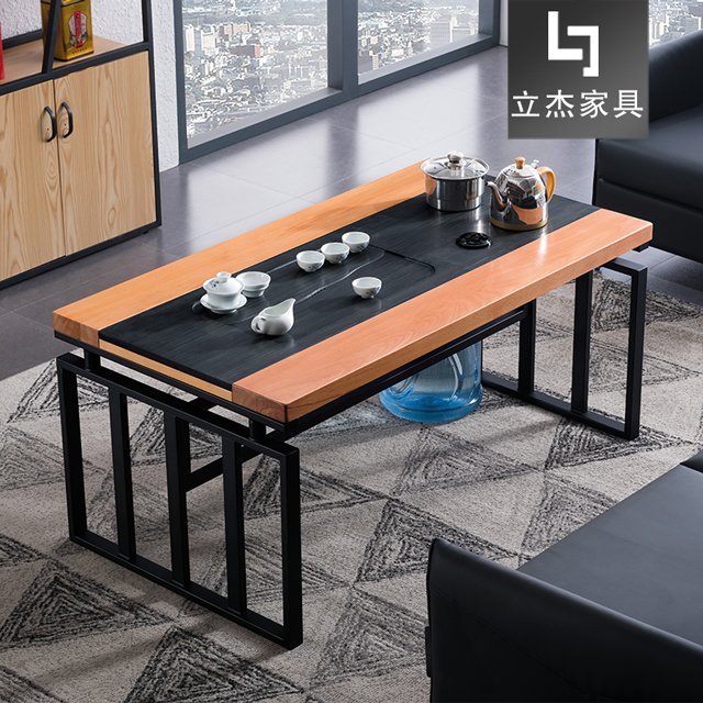 45MM乌金石+实木组合台面,有原木色和红木色两色选择,优质喷涂钢架,一体式精美茶盘+全自动智能隐藏式抽水电子茶炉